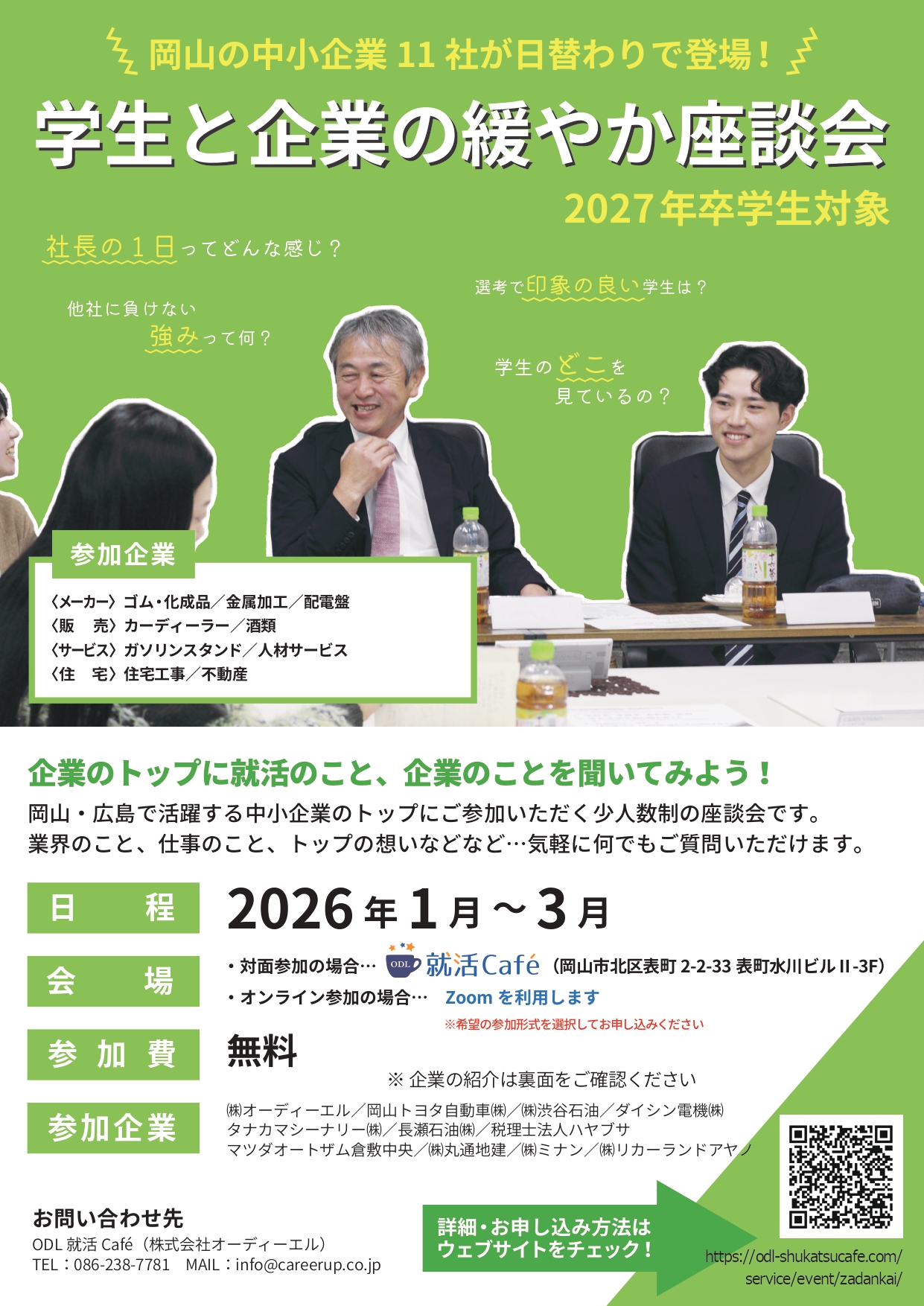 そんなあなたに、「学生と企業の緩やか座談会」。岡山の地元企業、全11社のトップがODL就活Caféにやってきます!ODL就活Caféの座談会の大きな特徴は、「企業のトップに訊きたい本音の質問ができること」。